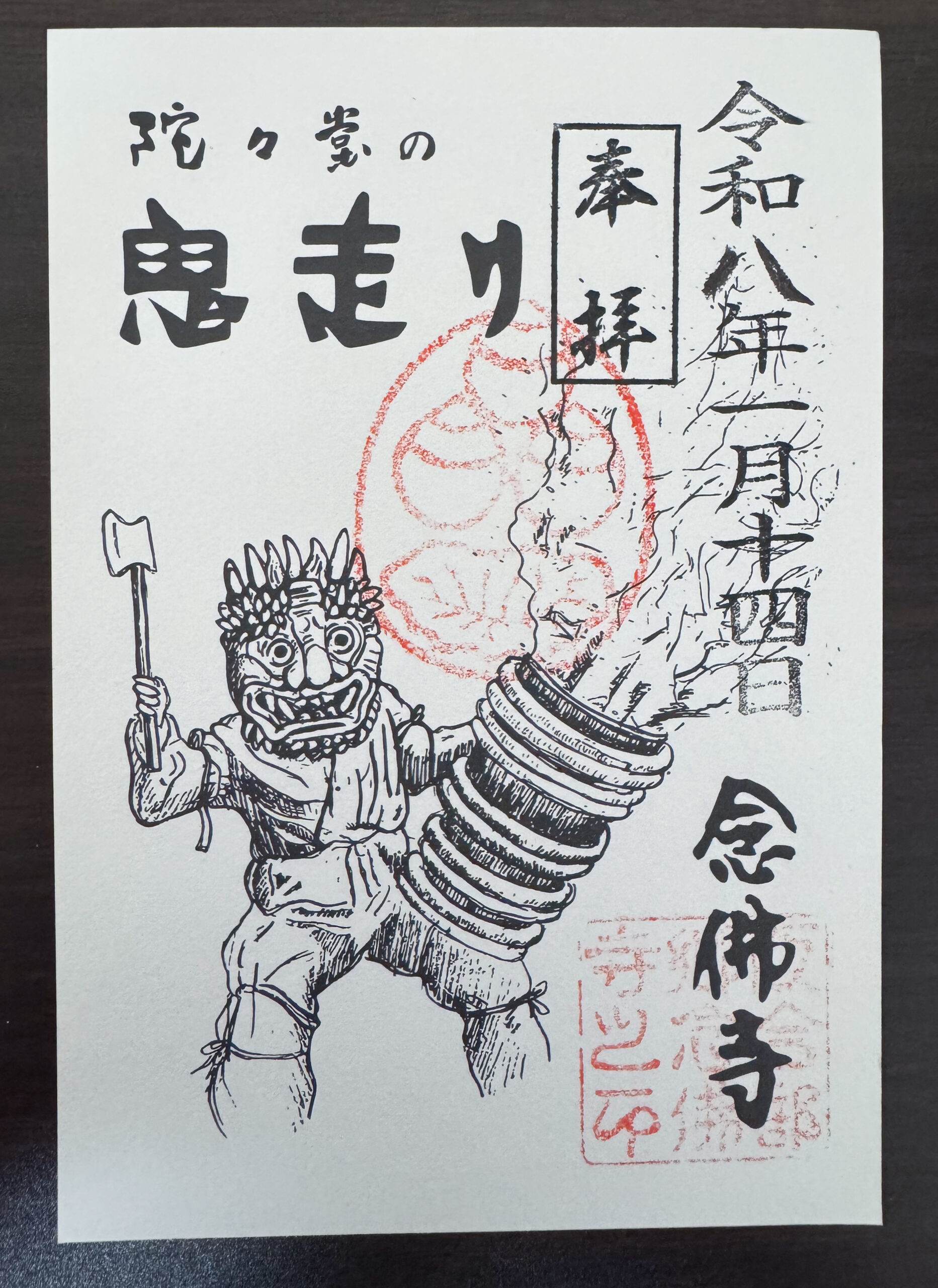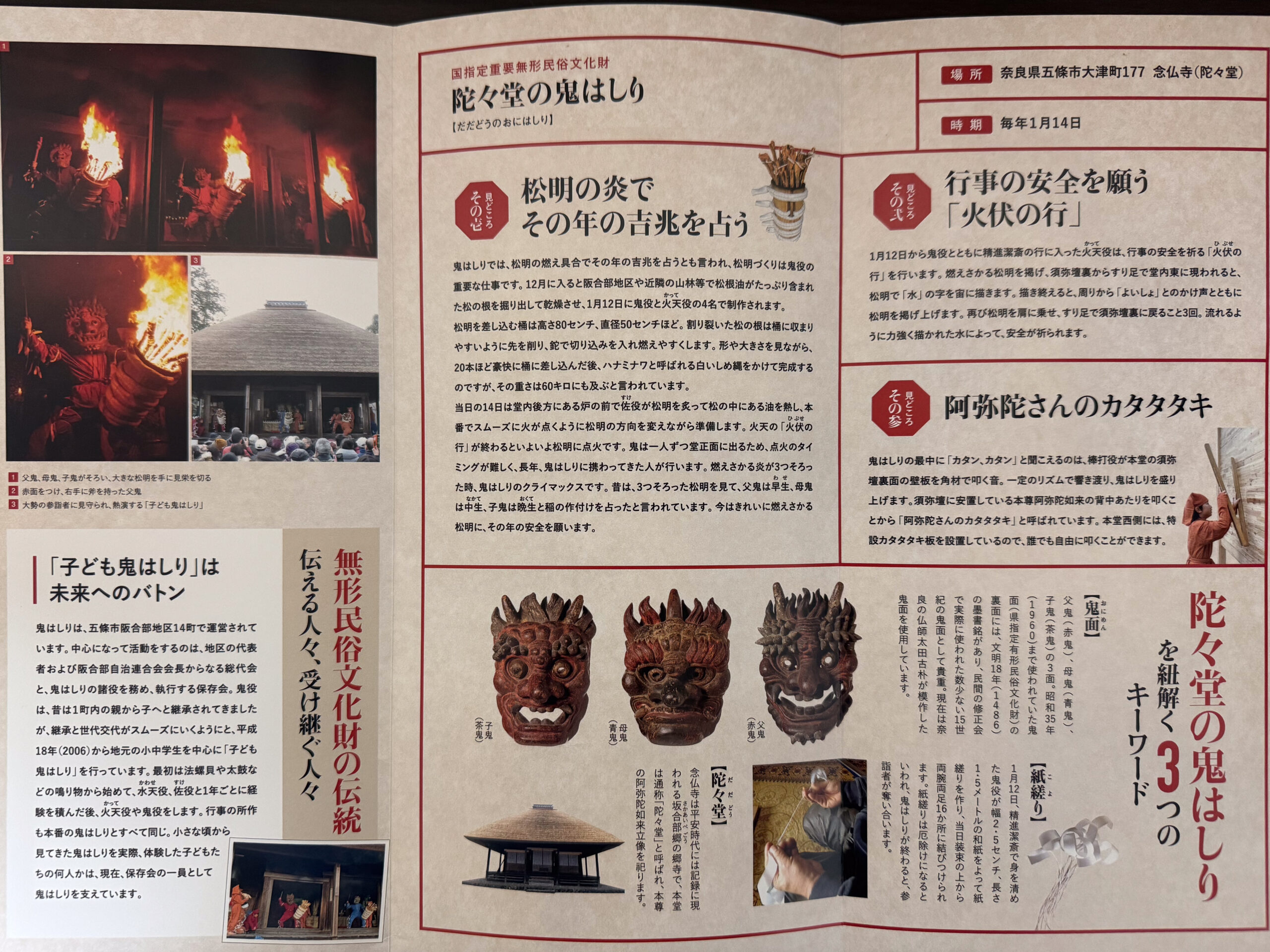 五條市大津町の陀々堂(念仏寺)では、修正会(しゅしょうえ)の結願行事として毎年1月14日に「鬼はしり」が行われます。