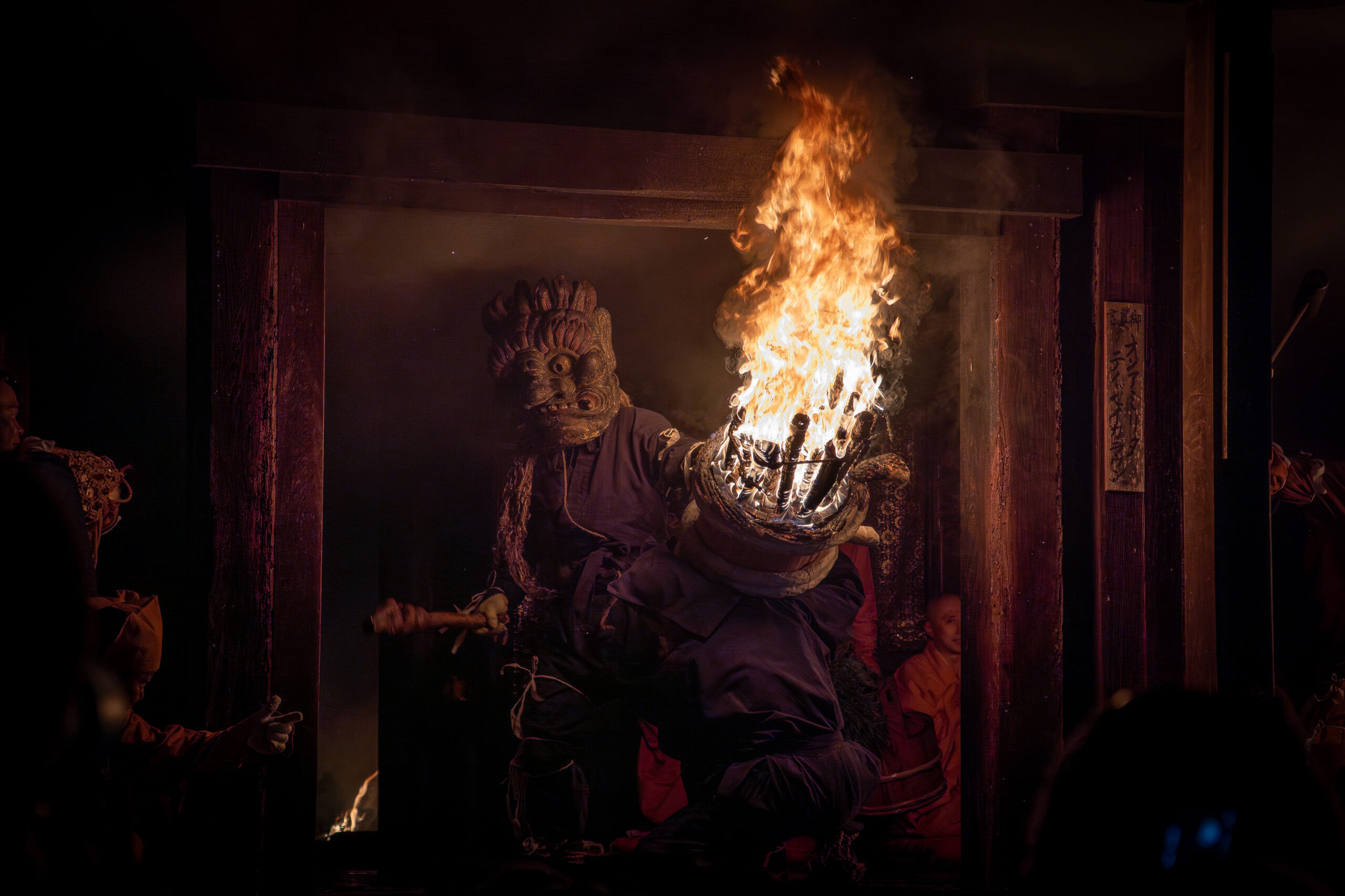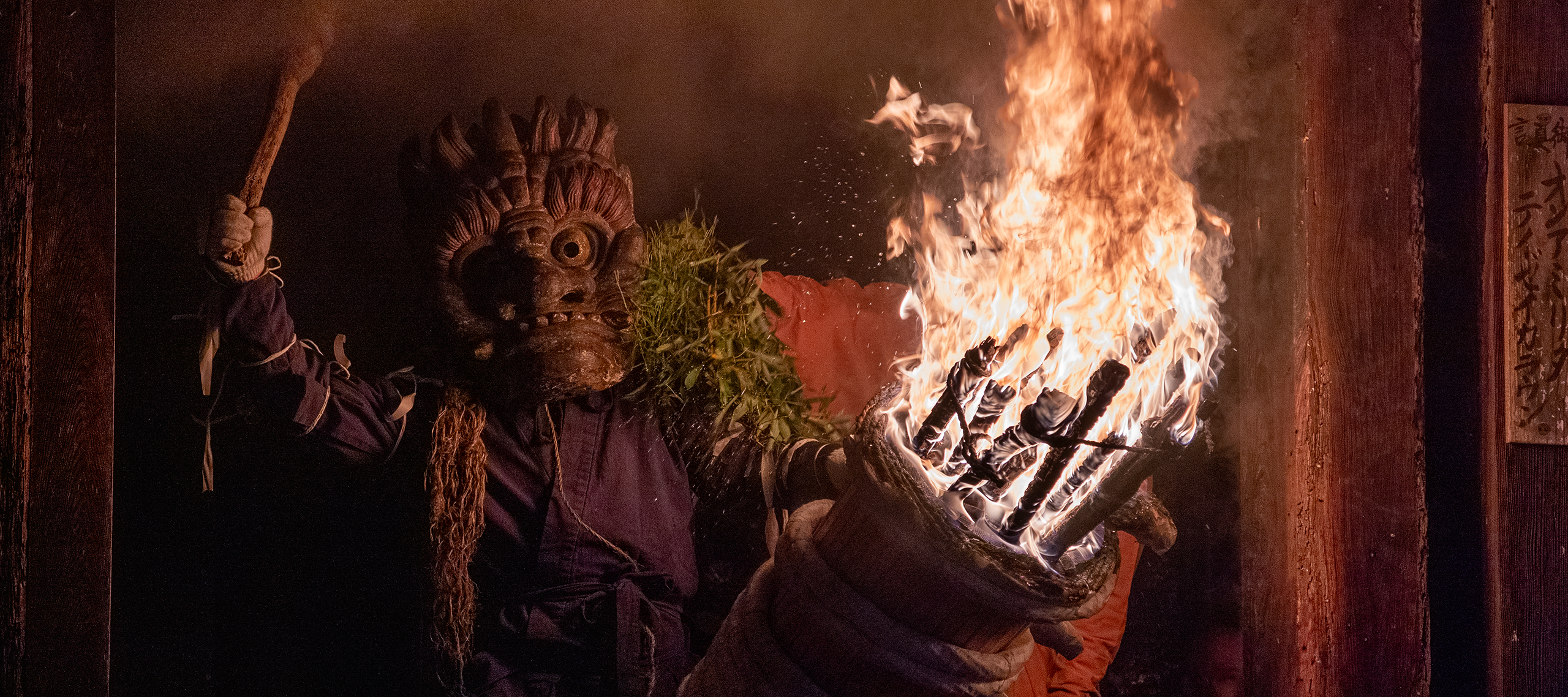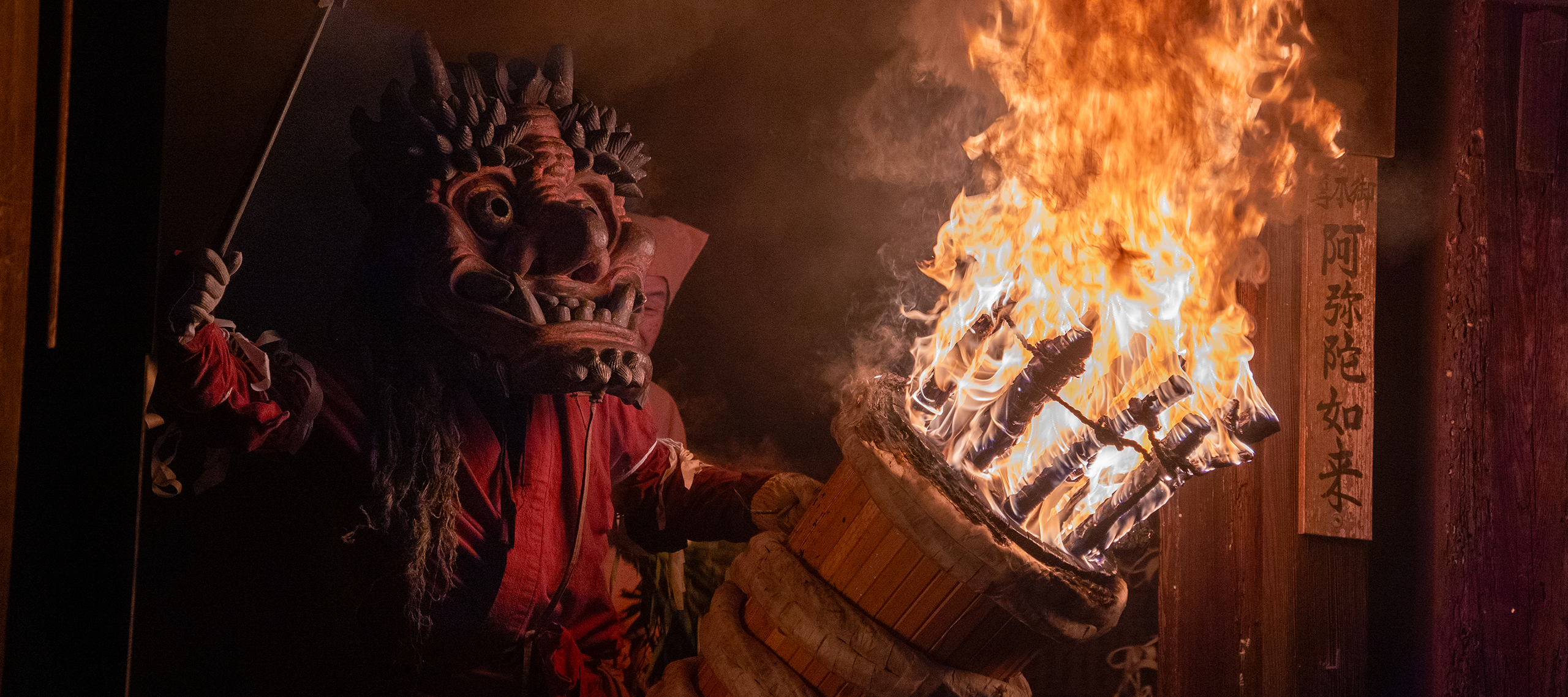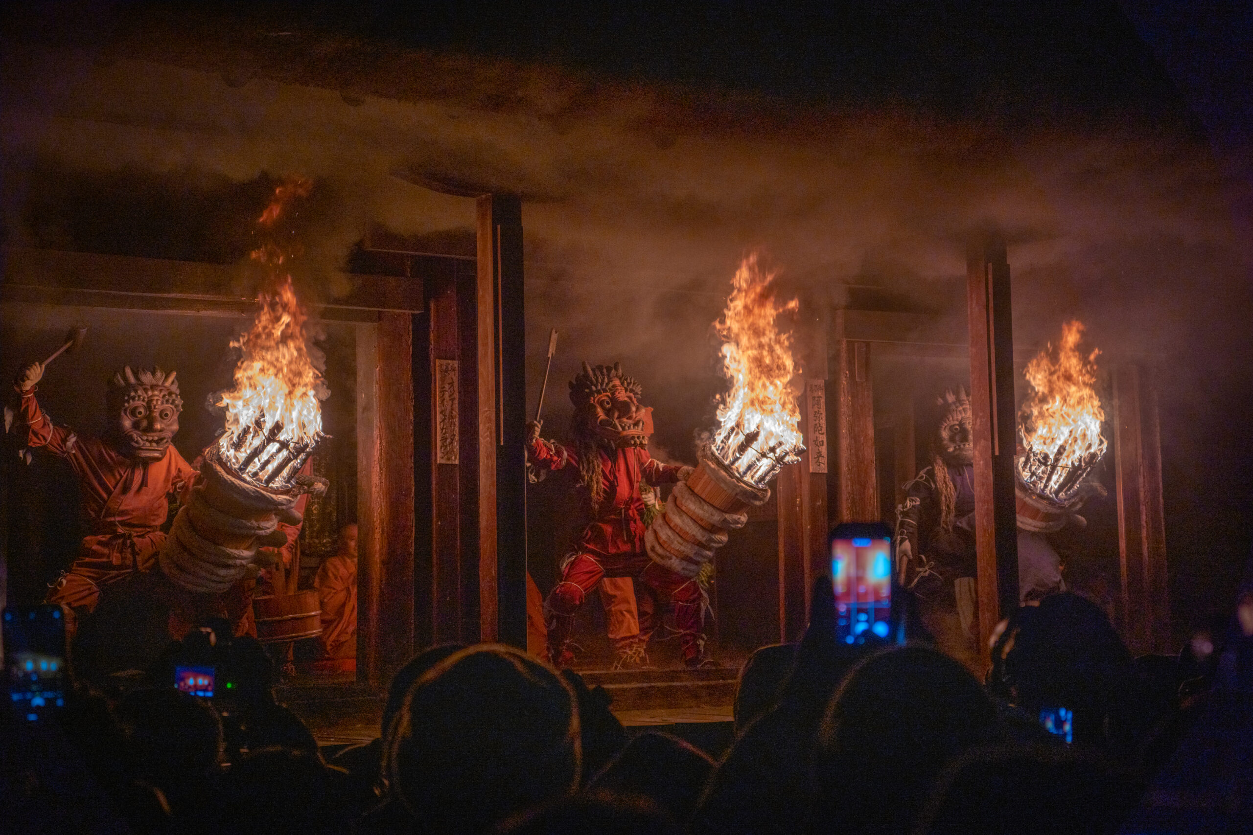 燃えさかる松明を振りかざした父鬼、母鬼、子鬼が堂内を豪快に巡り、人々の災厄を払い、福をもたらします。
